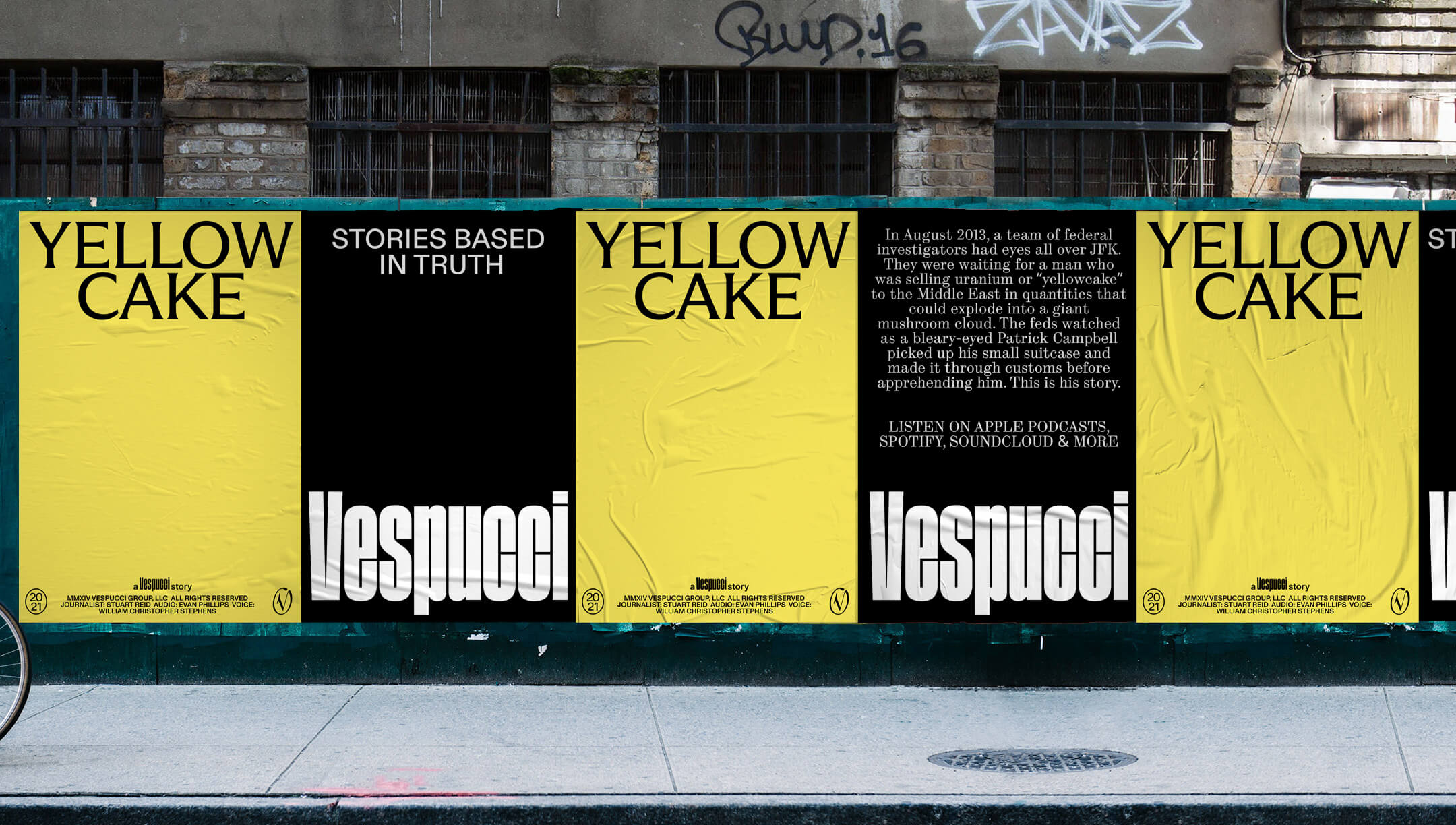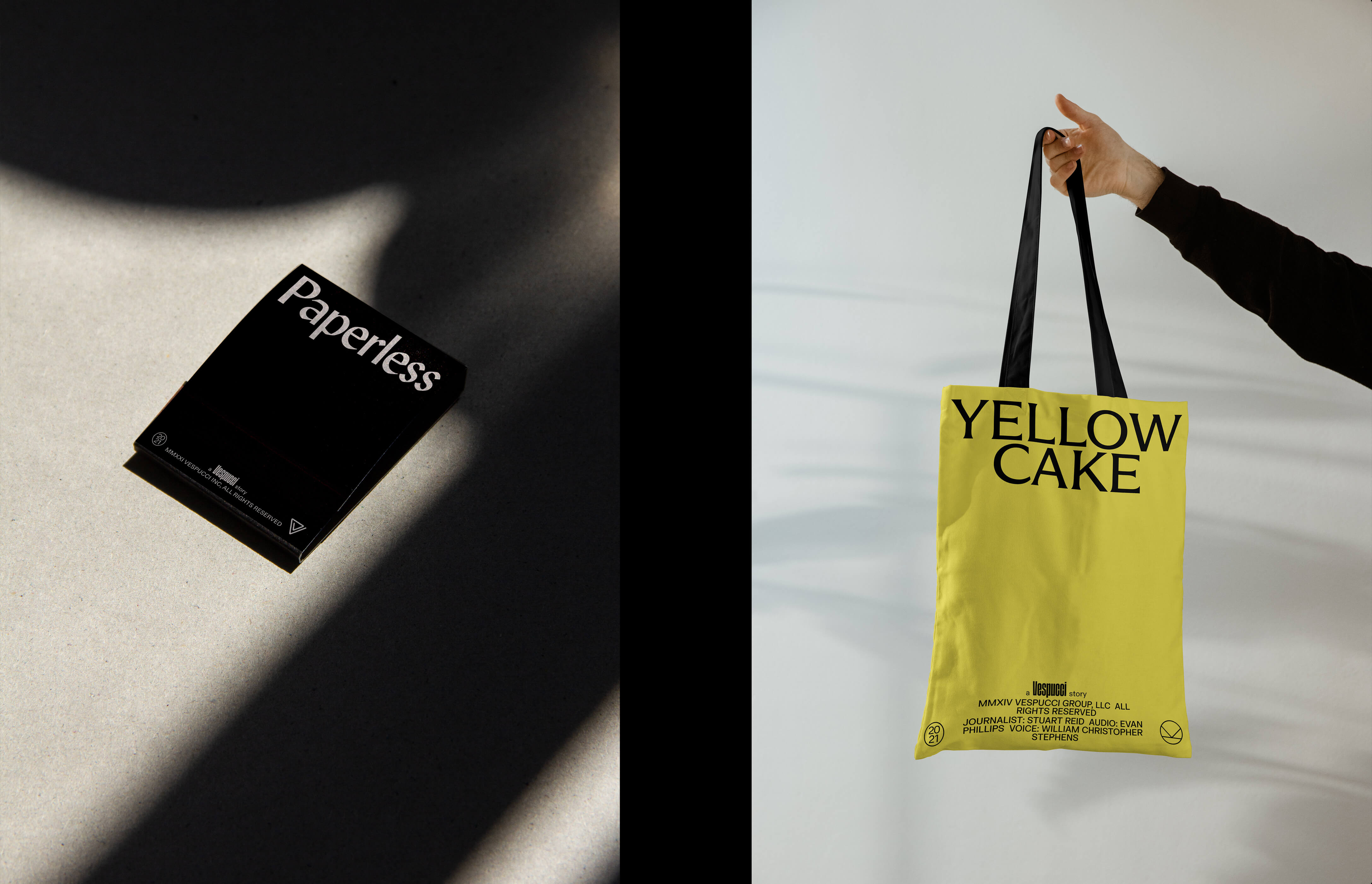Our identity activates when combined with our system established for a story’s artwork. The Vespucci wordmark can be paired with other stories in various ways.