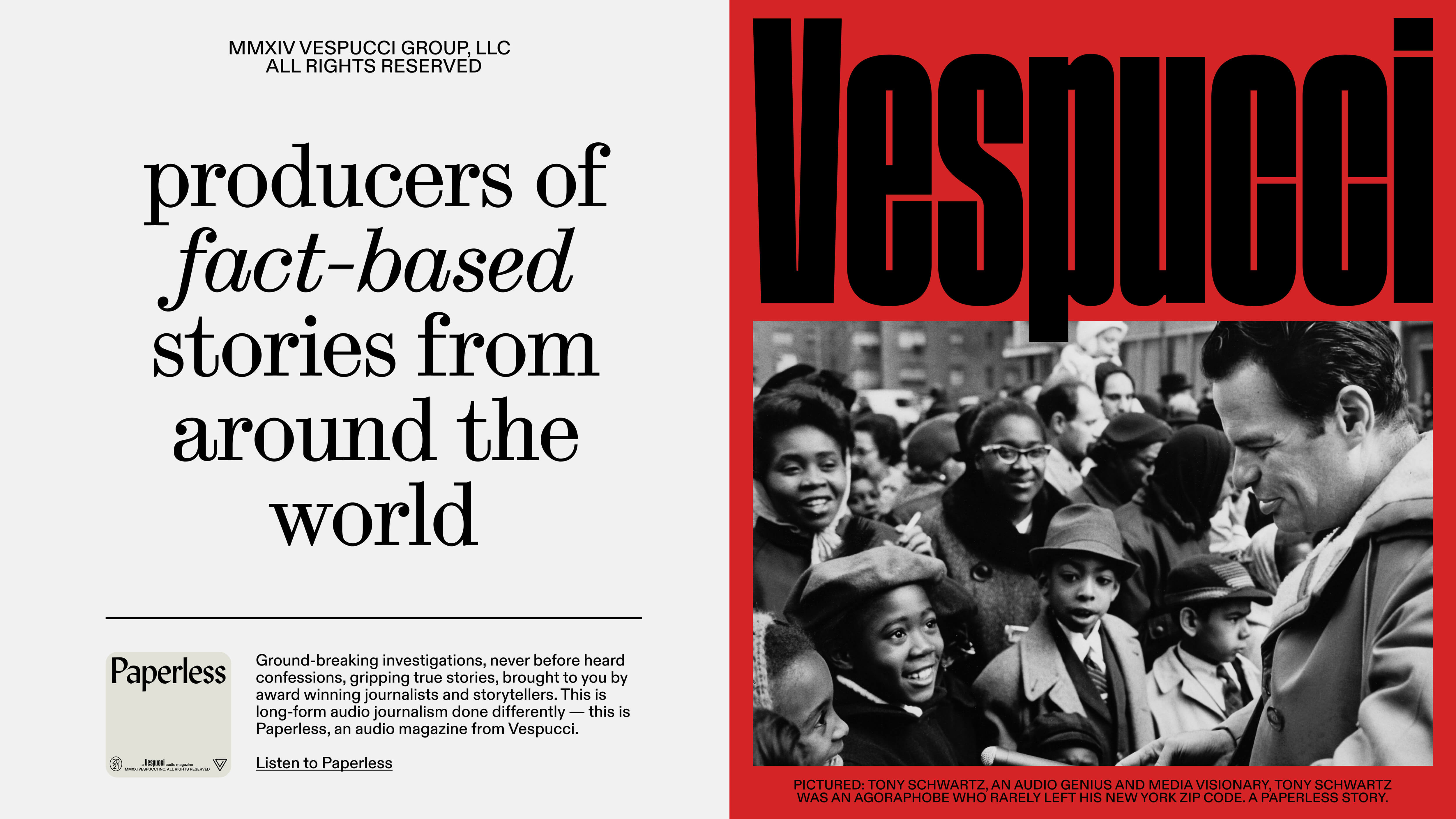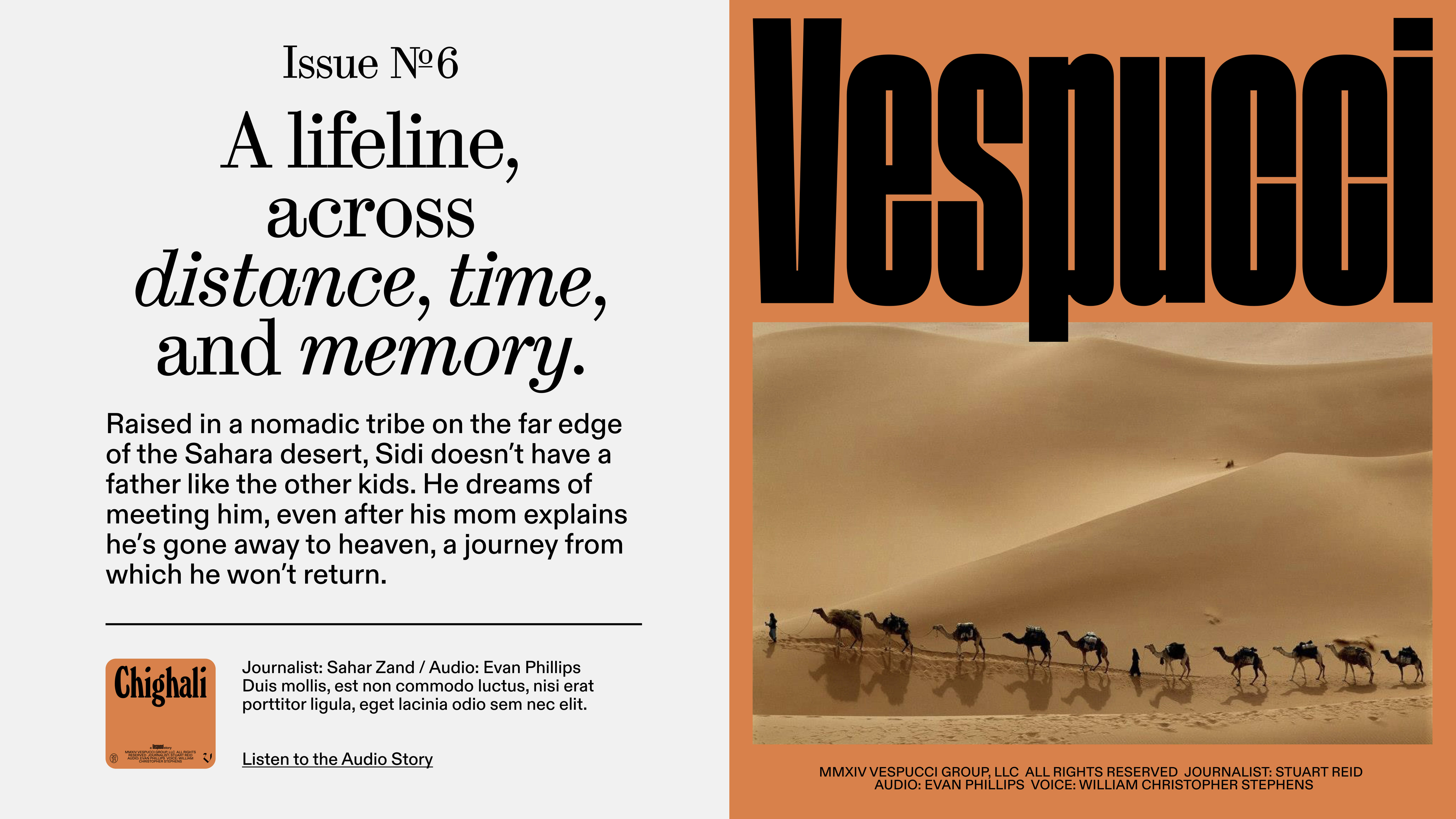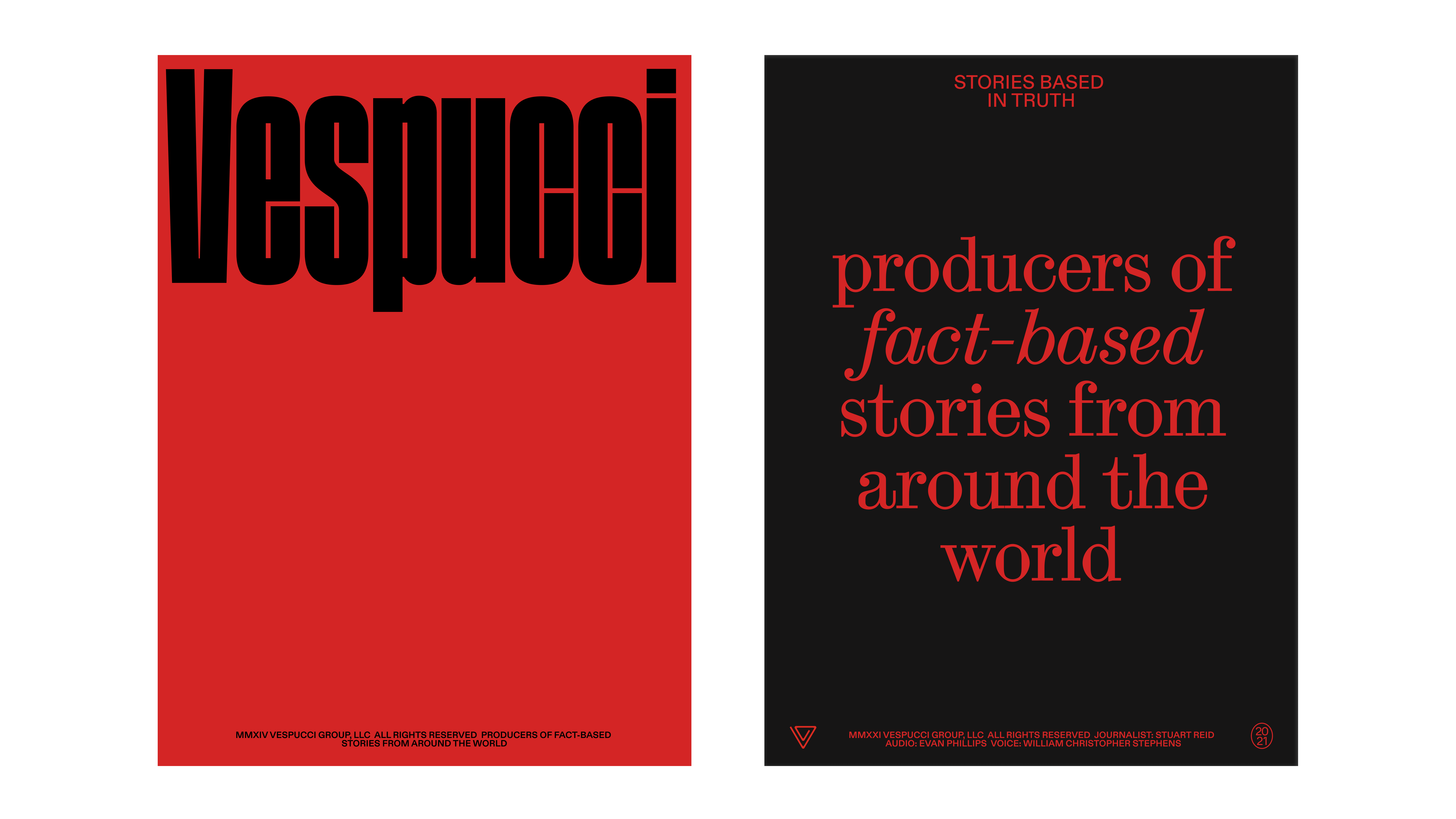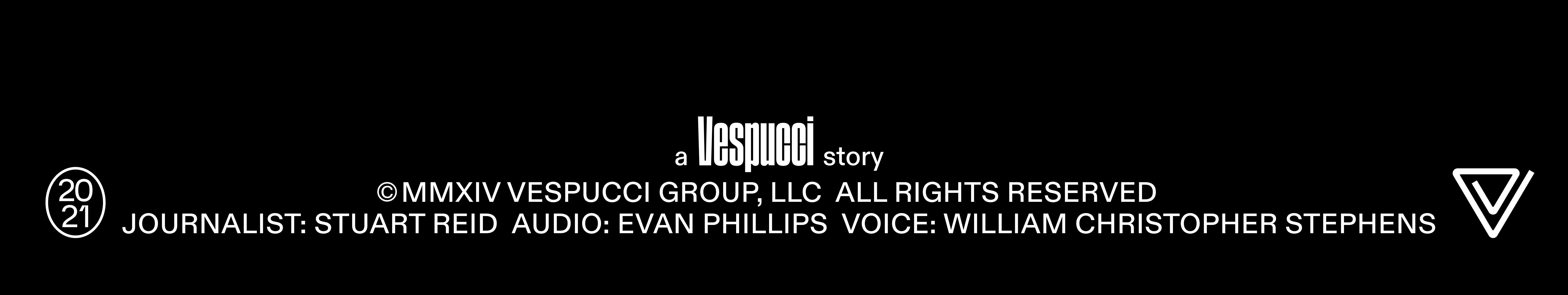 Our lockup should always feature “a Vespucci story” on the first line. The following lines should add a copyright message, followed by the credits for each piece. Please credit collaborators with their title and a colon before their name. Please also only use a single space to separate each collaborator. The key is to create a solid typographic block: allow for credits to flow from line to line, the goal is a tight lock-up of text. The credits lock-up should always be flanked with the current year and the Vespucci “paperclip” logo or one of Vespucci’s alternative marks below.