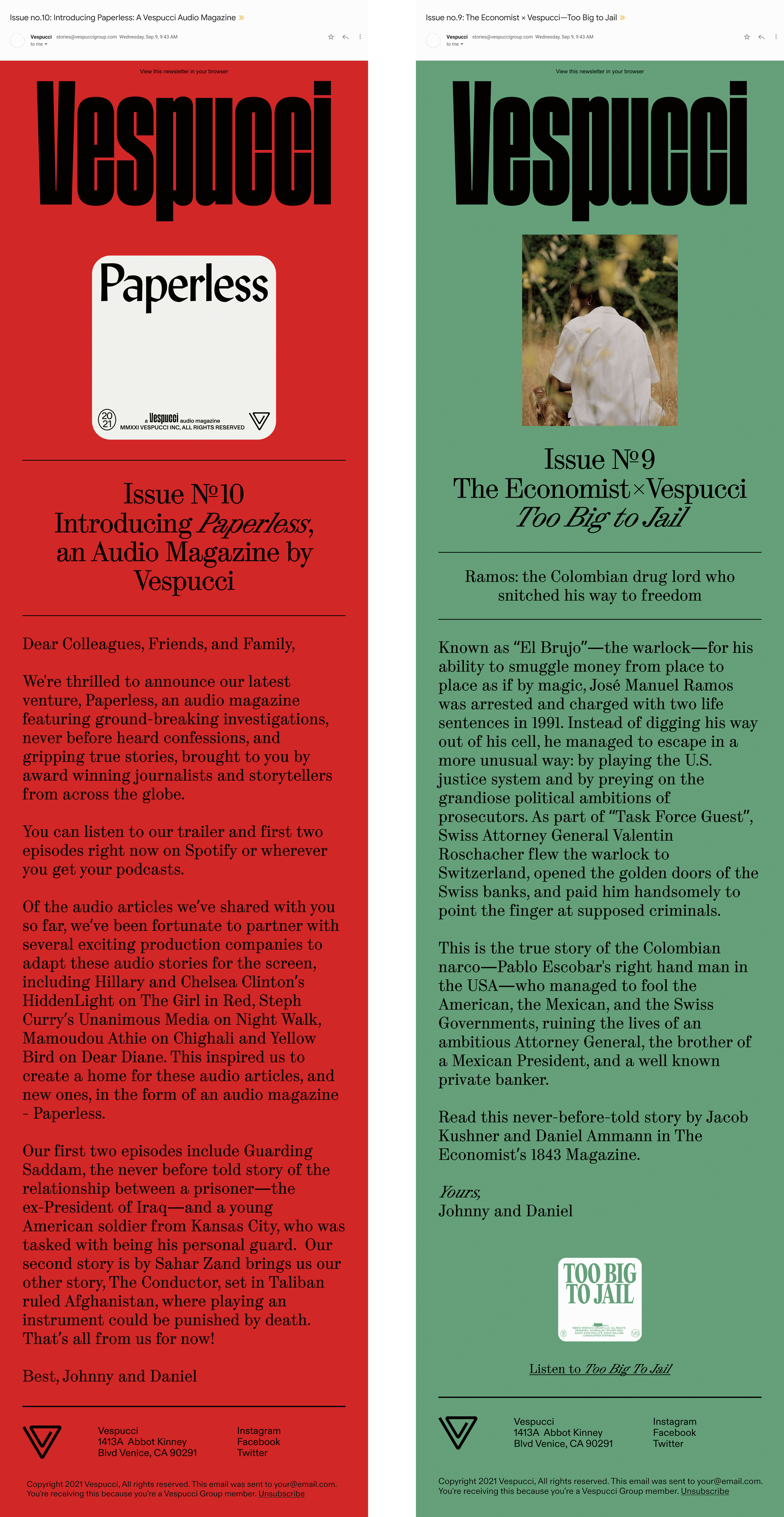 The above email templates illustrate our identity’s flexability: When a Vespucci related message is communicated, we fully embrace our bold red background. When our messaging emphasizes a story, the color and imagery can adapt to the story’s artwork system.