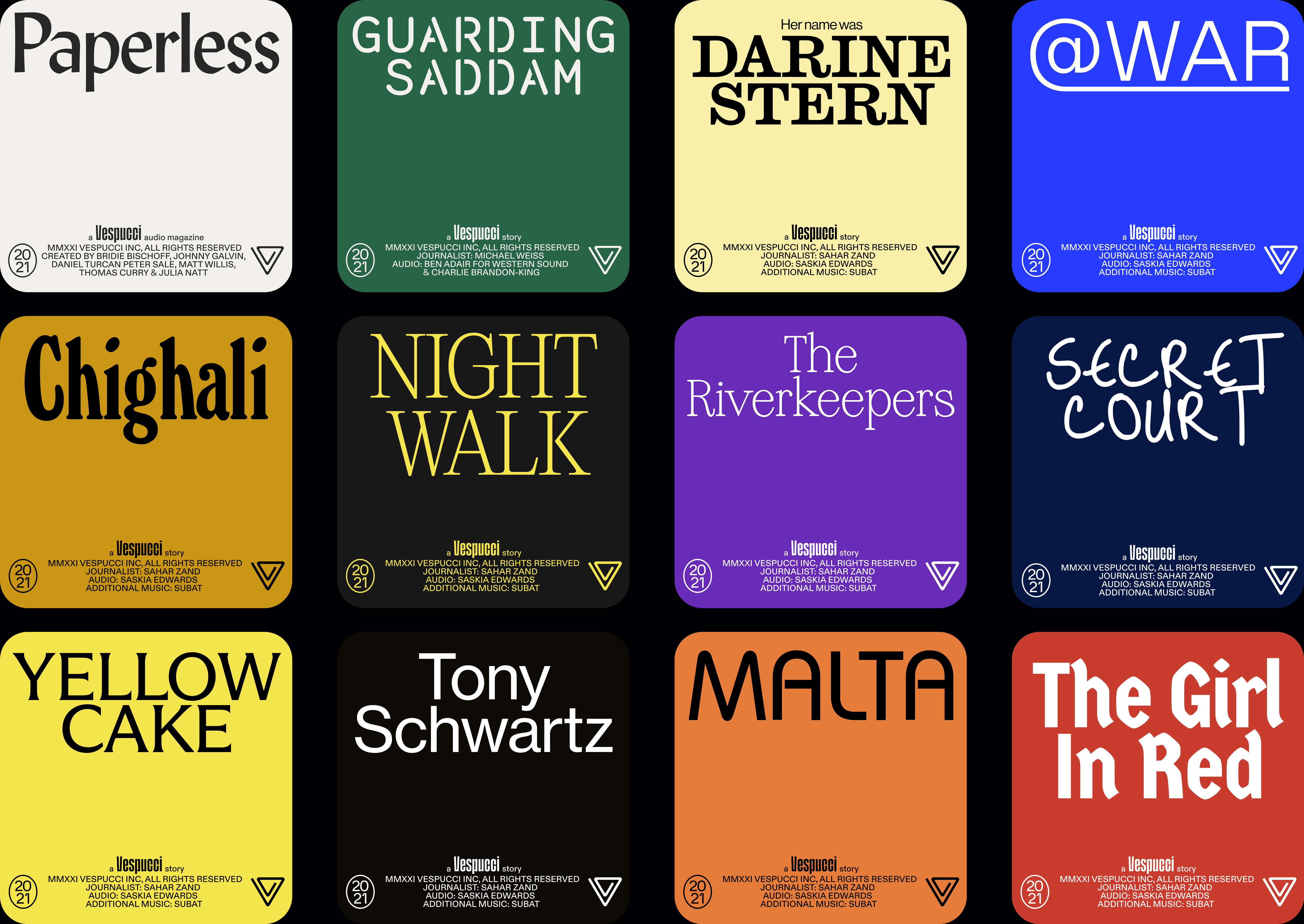 A key element to our identity is the “credits lock-up” system. Vespucci collaborates with journalists, artists and other creatives to shape and share their stories. This collaboration is reflected in the crediting of creators whenever possible using this lock-up. It takes inspiration from old film cards, borrowing from this vernacular in a contemporary way.